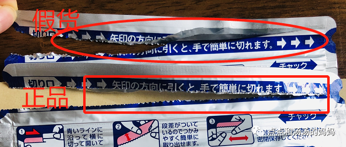 假货:撕拉条处也有规则排列的切割纹路,用手触摸纹路略粗糙,顺着箭头撕拉比正品稍用力一些,撕拉时容易偏离切割纹路,开口不平整。