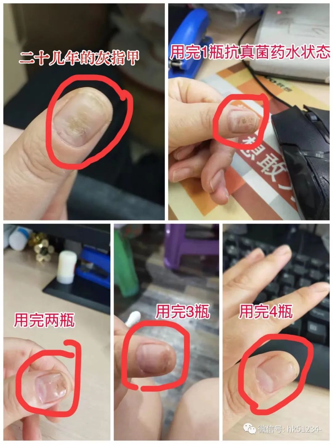 二十几年的灰指甲治愈过程,用抗真菌药水之前、用完一瓶、用完两瓶、用完3瓶、用完4瓶,五个阶段