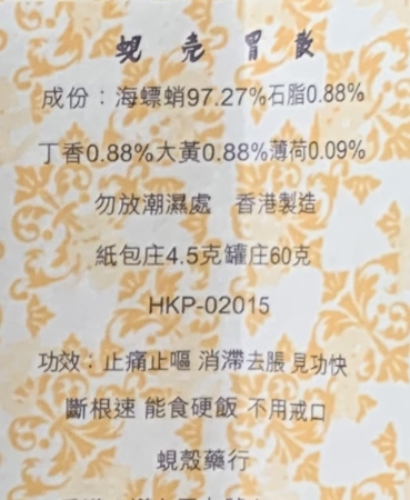 从蚬壳胃散的成分组成中,不难判断蚬壳胃散是寒性还是热性。海螵蛸,石脂,丁香,都是温热性中药,这三种成分含量占蚬壳胃散的99.03%。而寒性的大黄和薄荷只占0.97%。很明显,蚬壳胃散还是温热为主的。